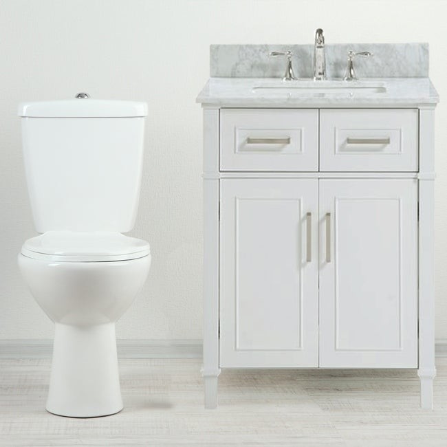 Eviva happy 30 inch x 18 inch white transitional bathroom vanity with white carrara marble countertop and undermount porcelain sink.